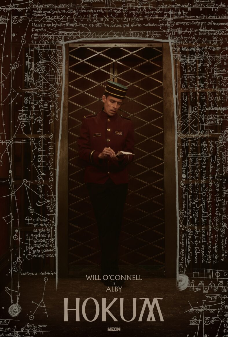 A new enigmatic poster for Hokum was released today, featuring a solitary hotel bellhop framed in an elevator, surrounded by cryptic chalk-like equations and symbols that suggest hidden patterns, obsession, and psychological intrigue.
