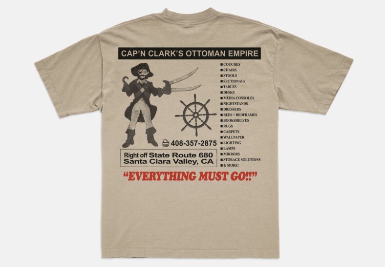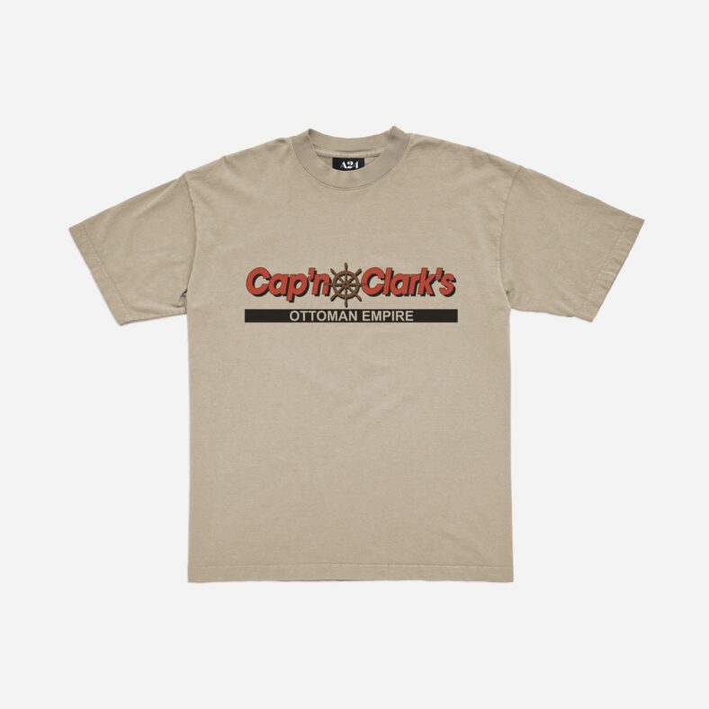 Now, A24 is making actual merch for Cap’n Clark’s Ottoman Empire, including the very first screen-printed beige cotton t-shirt that’s currently available in the A24 shop.